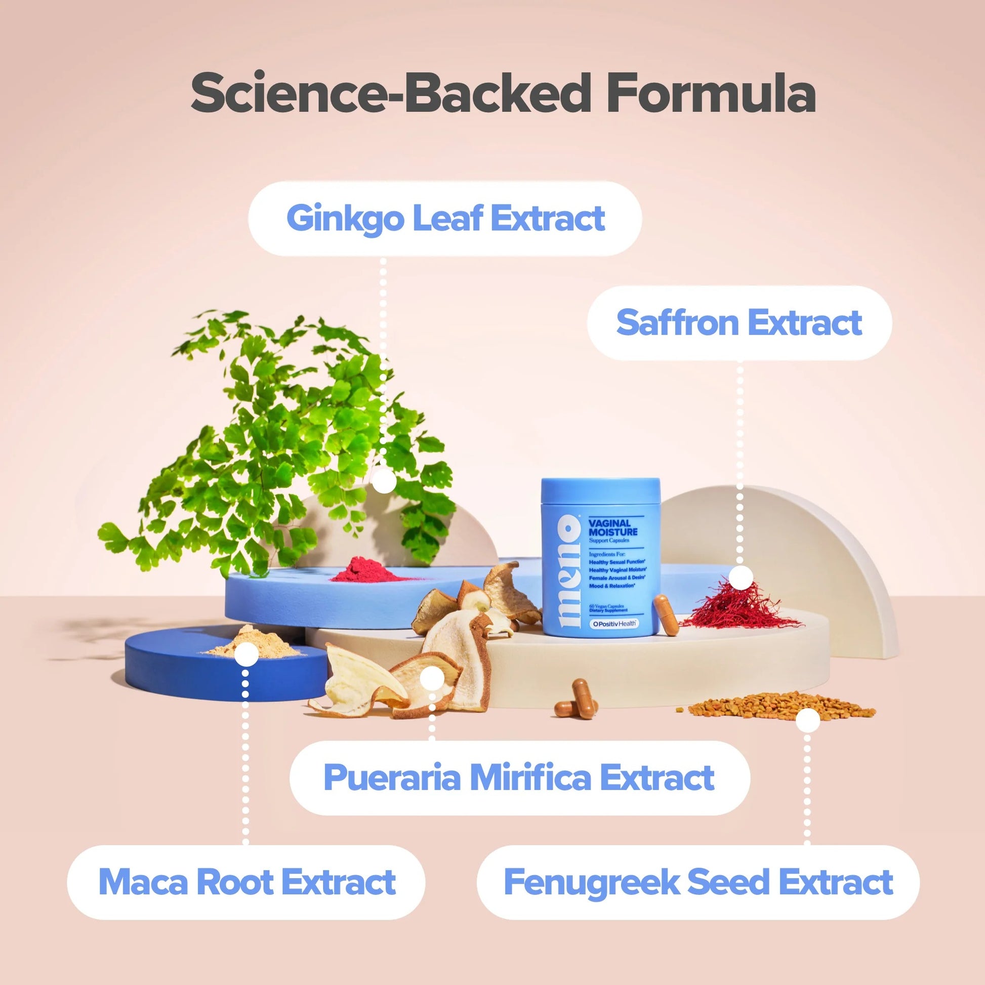 MENO Vaginal Moisture contains clinically-studiedamounts of both pueraria mirifica and fenugreekextracts, both shown to have estrogenic effects. Thismeans they can mimic estrogen to help supporthealthy vaginal tissue & moisture.
